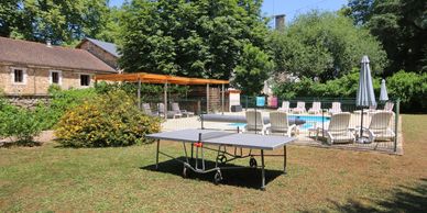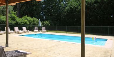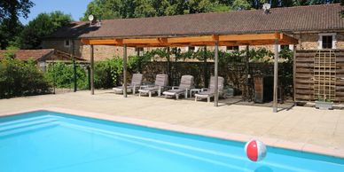 A view of the pool's shaded area and shower, perfect shade for those very hot Summer days.